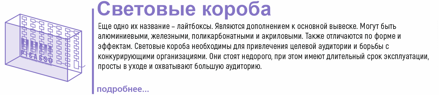 Кроме того допускается размещение информации о деятельности компании. Речь идет о том, чтоб писать на вывеске: «кафе», «ресторан», «магазин», «торгово-развлекательный центр» и т.д. При этом стоит помнить, что нельзя упоминать название брендов и торговых марок, а также рекламные лозунги и призывы воспользоваться услугой или приобрести товар. Для всего этого потребуется согласования рекламы.